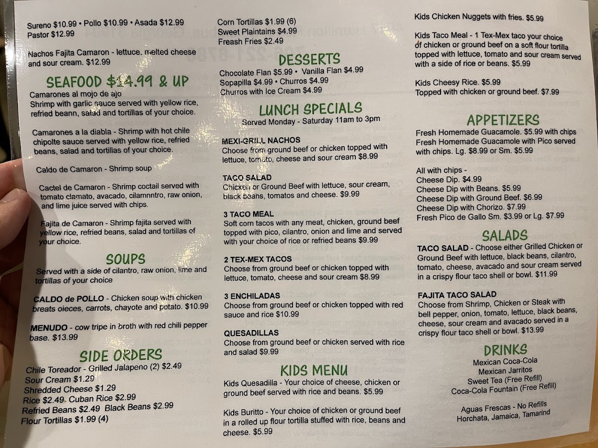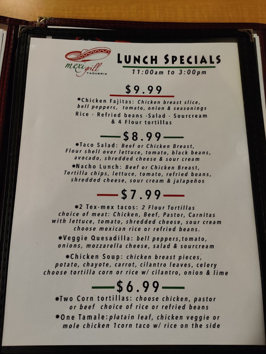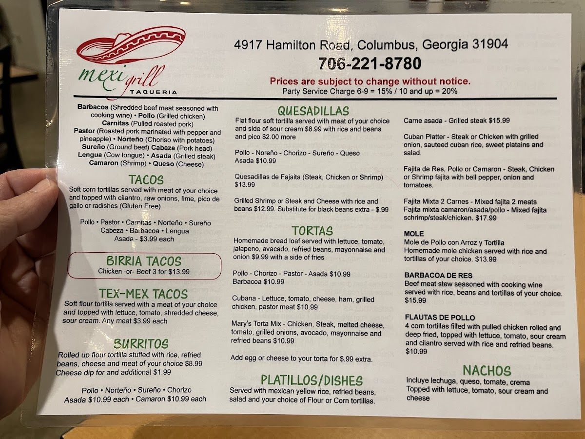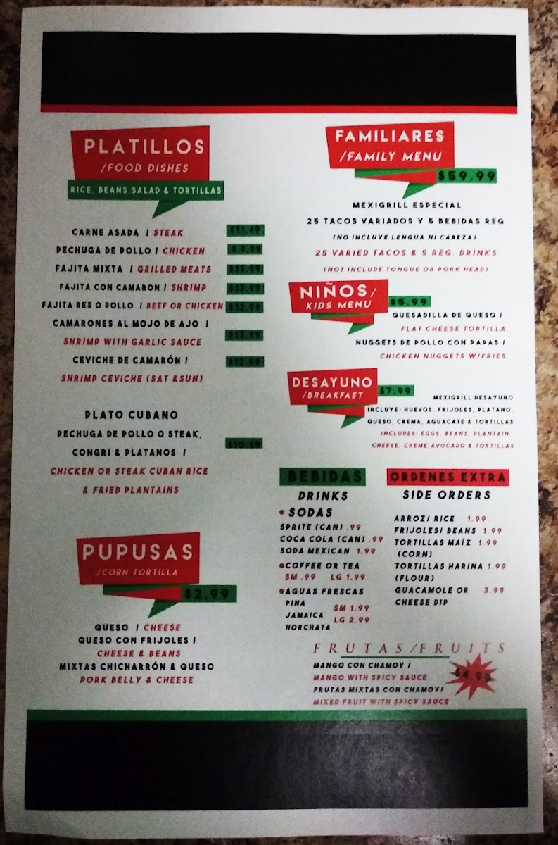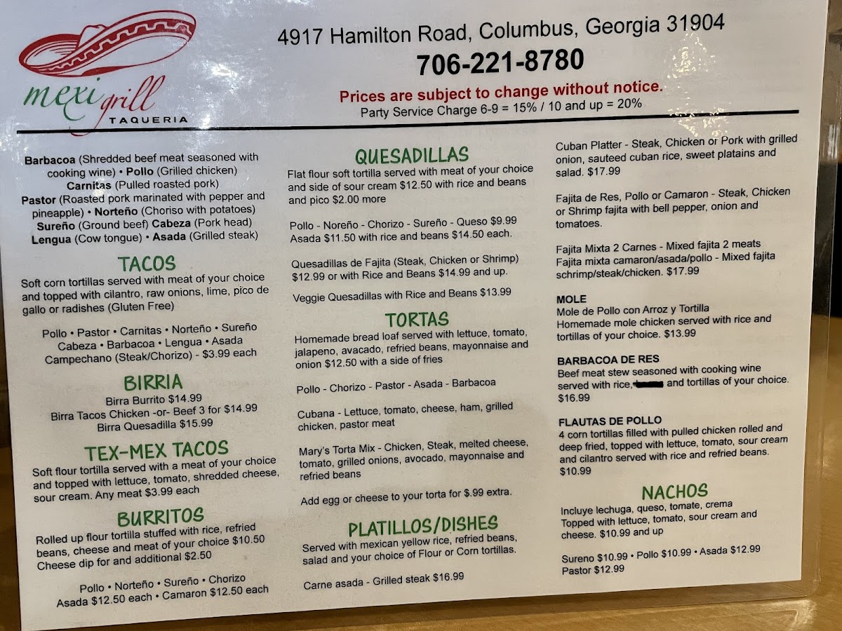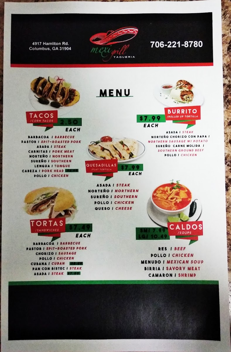 If you're craving bold flavors and authentic Mexican dishes, the Mexigrill Taquería Menu has got you covered. Located at 4917 Hamilton Rd, Columbus, GA, this cozy spot brings the true taste of Mexican street food straight to your table. You’ll find an array of tacos, burritos, and quesadillas made with fresh ingredients and served with a side of delicious salsa that’s sure to elevate your meal. Whether you're in the mood for something spicy or prefer a milder bite, the menu offers a variety of options to suit every craving. For those who like it hot, the grilled meats and tangy toppings won’t disappoint. Don’t forget to try the house-made chips and guacamole, which pair perfectly with any dish. It’s the kind of place where you can grab a quick lunch or settle in for a relaxed dinner with friends, and every bite feels like a mini fiesta.